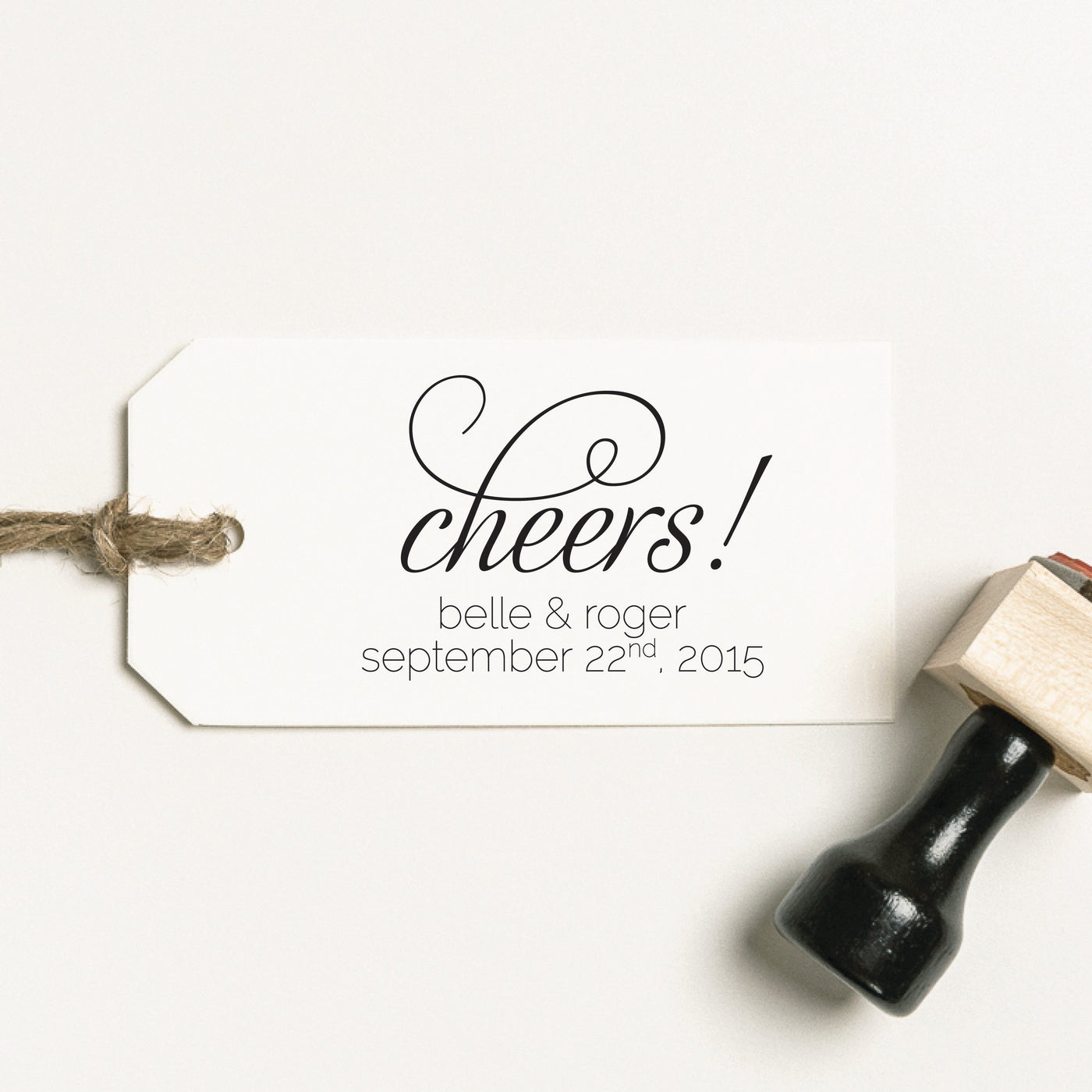 Easily personalise wedding favour gifts with a charming rubber stamp featuring the words "Cheers". Add the couple's names and wedding date for an extra special touch. This unique memento will be a cherished gift and lasting reminder of the special day.